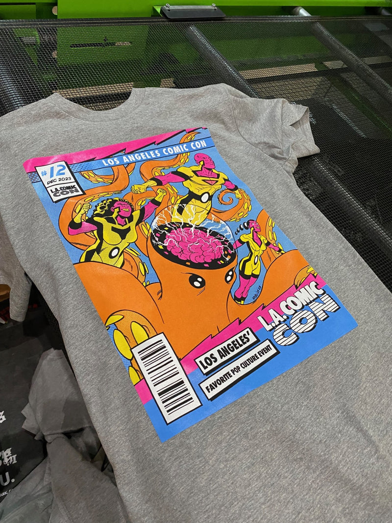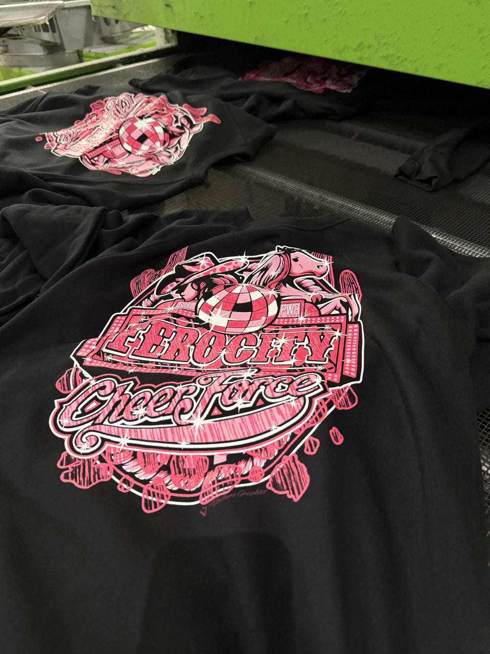 Discharge ink printing removes the dye from the garment and replaces it with pigment, creating an ultra-soft print that feels like part of the fabric rather than sitting on top. This method is ideal for dark, 100% cotton garments and produces vibrant, long-lasting results with a smooth, breathable finish. Perfect for high-end apparel, vintage looks, and designs where comfort and softness matter most.